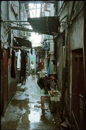 CHINA. Shanghai. Soon to be evicted inhabitants, near Panyu Rd. Often these old building are unfit for inhabitation but their subsiquent demolition means that the inhabitants can't afford to buy or rent the new flats that replaces them, so they are forced to move to the outskirts of the city, far from their work and their way of life. June 2006.