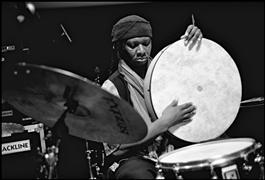 FRANCE. Ile-de-France region. Val de Marne department. Festival de musiques SONS D'HIVER. Vincennes. Centre Culturel Georges Pompidou. 142 rue de Fontenayt. "Eloping With The Sun". Soundcheck. American jazz musician Hamid Drake (bendir, small percussions). Saturday January 21st, 2006.