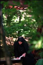 IRAN. Tehran. A woman wearing a black chador reads in the Jamshidiye Park.