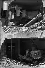 PALESTINE. Gaza city. A Palestinian recuperates Islamic artifacts in his apartment destroyed by Israeli armour which occupied the enclave for a week. On his right hand, the word Allah in Arabic.