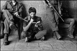 ISRAEL. Jerusalem. An armed soldier reads from Jewish sacred texts.