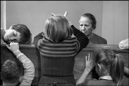 their vibratory senses. Music education. Children, all deaf-mutes, touch the piano with their hands, forehead or temple in order to hear the vibration of the music. Two children hold stocks, when they hear a "forte", they hit sticks together.