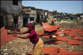 INDIA. Mumbai. 2006. Leather tannery workers drying skins on a n open space in the Kalyanwadi area, the traditional leather tannery area of Dharavi. The number of tanneries has dropped dramatically over the years, as most of that industry has shifted out of Bombay, many in Chennai. The tanneries are among Dharavi's original industries, although most of them have closed down today, partially because of the polluting nature of the industry