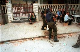 REPUBLIC OF MACEDONIA. Arachinovo. June 2001. Ethnic Albanian village, Macedonian policemen and ethnic Albanians. After ethnic Albanian rebels of the NLA, National Liberation Army had been evacuated by US troops in a Nato brookered deal, Macedonian governement forces retook control of the village in the outskirts of the capital Skopje.