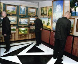 Prisoners looking at paintings made in the camp. During a 2 week vacation spent in a camp building, prisoners can paint, have a sauna and live in more private rooms.