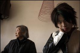 CHINA. Anhui province. A young mingong who works as employee in a hairdressing salon in Wenzhou (Zhejiang province) back in his native village for the Spring Festival. Here with her grand-mother. 2007.