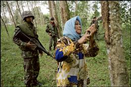 THAILAND. Pattani Province. Utae Majae Village. Thai army soldiers patrol a rubber plantation with a Muslim woman at work.