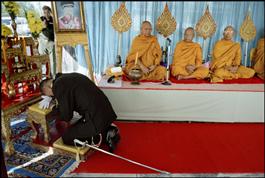 THAILAND. Pattani Province. In an army barrack, General Akkawut Phothipath, Commander of the Armed Forces in the south, kneels to a Buddhist shrine adorned with the King’s portrait, during the celebrations of Army Day.