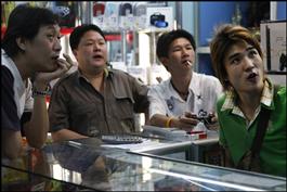 THAILAND. Bangkok. 2007. Klong Ong Ang market. Video game salesmen try out a new game.