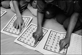 BANGLADESH. Kurigram District. Chor Hori Kesh village. Made landless by their farming plots washed away by regular floods of the Brahmaputra river, peasants fall into a pattern of bonded labour to pay off their debt. In a courtyard, children learn to read in a class provided by an NGO.