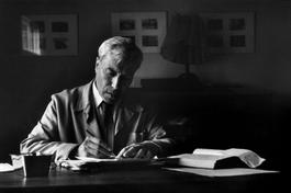 USSR. RUSSIA. Peredelkino, near Moscow. Soviet poet and writer Boris PASTERNAK at his desk, writing his response to the Nobel Prize committee, upon receiving the Literature award in the study of his dacha. 1958.