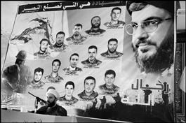 LEBANON. Ainata. A Shia mullah addresses a ceremony called to honour 14 Hezbollah (Party of God) fighters from the village killed by Israeli forces during the war of July 12-August 14. Their portraits adorn a large poster dominated by Sheikh Hassan NASRALLAH, leader of the Hezbollah.