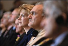 Carly Fiorina (chairman and CEO, Hewlett Packard, USA), Prince Turki al Faisal al Saud (chairman, King Faisal Center for Research and Islamic Studies, Saudi Arabia) and others watching Iranian President Khatami's address.