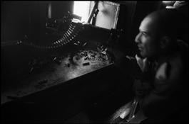 IDF (Israel Defense Forces) soldier shoots warning shots at Palestinian men who get too close to the watchtower. Rafah.