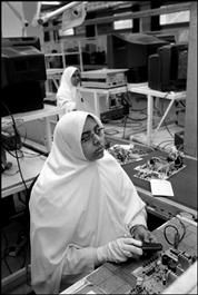 EGYPT. Cairo 2004. A Muslim woman, wearing the hijab, at work in the Ahmad Baghat Electronics plant which manufactures television sets.