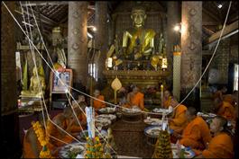 LAOS. Luang Prabang. Wat XIENG THONG celebrates the yearly ritual of Bun Kop Hop in honour of the temple. Buddhist monks are fed lunch.