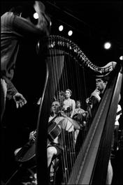 HOCUS POCUS ORCHESTRA: made up of young musicians who participated in an improvised music workshop held by French jazz musicians Claude TCHAMITCHIAN (doublebass), Philippe AUBRY (saxophones) and Samuel COLARD (piano). Samuel COLARD (left) is here seen conducting the musicians. Saturday 25th August, 2001.