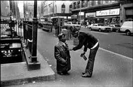 USA. New York City. Herald Square. Man with beer can speaking with double amputee. 1976.