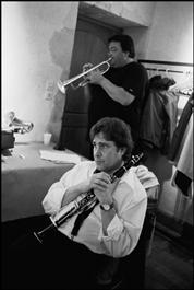 France. PAYS DE LA LOIRE Region. SARTHE Department. City of LE MANS. EUROPA JAZZ FESTIVAL 22nd Edition. In the foreground, french Musician Louis SCLAVIS (clarinets, saxophones), with Jean-Luc CAPPOZZO (trumpet). Backstage before their concert with LOUIS SCLAVIS QUINTET. Saturday April 28th, 2001.