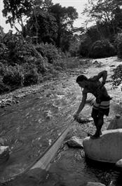 VENEZUELA. Bachichida village. A Bari Indian fishes with a net by the river. He holds one of his catches in his mouth.
