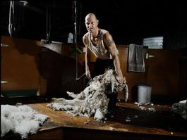 NEW ZEALAND. Near Otamatapaio. 2014. Farmer shearing a sheep.