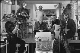 FRANCE. Ile-de-France region. Yvelines department. Bougival. Center, Belgian painter Pierre ALECHINSKY in his atelier.Shooting of documentary "L'oeil du peintre" written by (second on the right) French journalist and producer Pierre DUMAYET and directed by (behind ALENCHINSKY) French director Robert BOBER. A La Sept/ARTE Production. Second on the left, French sound technician and composer Daniel DESHAYS. Thursday 23rd May, 1996.