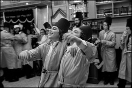ISRAEL. Jerusalem. Mea Sharim neighborhood. Within their synagogue, Orthodox Masmidim Jews celebrate, with heavy drinking of alcohol and dancing, the Jewish festival of Purim, when Queen ESTHER of Iran saved her people from being murdered.