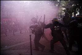 FRANCE. Paris. May 16, 2013. A demonstration organized by the "French in Revolt" group in Sorbonne square. Among them are The Hommens, a movement formed in response to allegations of police brutality against children that occurred during the March 24th "Manif pour tous." Other groups opposed to the Taubira gay marriage law continued to demonstrate with the goal of developing a peaceful and democratic discussion on the topic. These protestors claim that action reminiscent of the great rising of May '68 would be repeated in May of 2013.