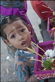 INDONESIA. BALI. A little girl takes offerings to the GOA LAWAH Hindu temple by the sea.