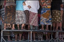 INDONESIA. BALI. Denpasar. The PURA PETILAN Hindu temple celebrates its annual ritual. Men, in ceremonial sarongs, watch a cockfight.