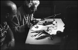 JERUSALEM. Professor Yigael YADIN, archeologist and former Chief of Staff of the Israel Defence Forces, watching Professor James BIBERKRAUT opening fragments of ancient scrolls.