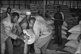 ETHIOPIA. Oromia Region. Selka. A sack is opened for quality control in the cooperative store for durum wheat which will be used to make pasta.