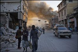 A man is seeing running the street as warehouses are on fire. On January 12 2010, Haiti was hit by an earthquake of magnitude 7, which mainly struck the area around the capital city. It left an estimated 200 000 dead, and over 1 million displaced people. The Caribbean island is one of the poorest countries in the world and is plagued by political unrest. In the wake of this devastating natural catastrophe, members of G7 countries decided to drop the debt owned by the Haitian state.