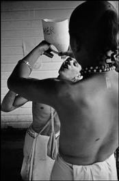U.S.A. West Virginia State. New Vrindavan near Moundsville. Annual gathering of the Hare Krishna Hindu sect to honor Guru Bhaktivedanta Swami Prabhupada. A devotee helps another to drink water from a plastic makeshift funnel.