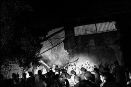 People gather at the site of a factory for industrial cleaning materials that burns after being targeted in a drone attack in downtown Gaza. 2014