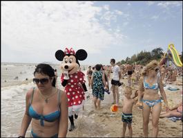 The crowded Azov sea shore in Ourzouf near Mariupol, near the Headquarter of the AZOZ pro-ukrainian battalion.