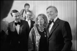 FRANCE. Cannes. 1980. Center, French actress Jeanne MOREAU and, on the right, US actor Kirk DOUGLAS, President of the 33rd Cannes International Film Festival Jury. At the Carlton Hotel, after the Legion d'Honneur award ceremony during which French Minister of Culture and Communication Jean-Philippe LECAT, here on the left next to Jeanne MOREAU, awarded her the honor. In the background, Norwegian fasion designer Per SPOOK. Friday 9th May, 1980.