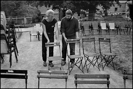 FRANCE. Brittany. Cotes du Nord (renamed Armor Coasts since 27th Feb. 1990). Chateau de la Roche Jagu. In the Municipality of Ploezal. Jazz E Breiz Festival 83. French double bass player and festival programme planner Henri TEXIER and French singer and festival programme planner Melaine FAVENNEC prepare the seats for the audience. Thursday 18th August, 1983.