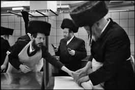 ISRAEL. Jerusalem. April. Hassidic Jews of the Belz sect, in ceremonial dress, bake mazot (unleaved flat bread) for Pessah, when they celebrate their coming out of Egypt. They will eat the mazot for a week.
