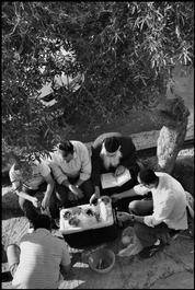ISRAEL. Meron. April. Pilgrims share a drink at the shrine of Rabbi SHIMON BAR YOHAI. One of them reads from sacred texts.