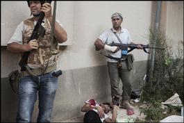 A civilan, suspected to be a Gaddafi loyalist, badly wounded lies on the floor surrounded by two armed anti-gaddafi rebels during the assault on Abu Salim. The rebels captured many Gaddafi loyalist fighters. Most of them are civilians who were paid by the government to fight for Gaddafi. They fought a lost cause. Many were black Africans, and there are signs everywhere of summary executions.by two anti-gaddafi rebels