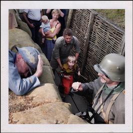BELGIUM. Paeschendaele. 2013. A Belgian family visits the trenches where German reenactors are spending a weekend.