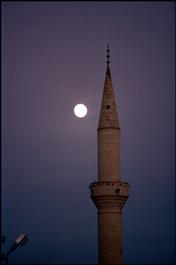 TURKEY. Nevsehir. Urgup. 2002. Moonrise over the minaret of a mosque.