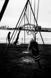 AUSTRALIA. Sydney. A man hangs from his feet on a swing in Balmain...