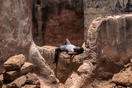 BURKINA FASO. Tiebele. 2021. 4-year-old Alloua Anooga lays on...