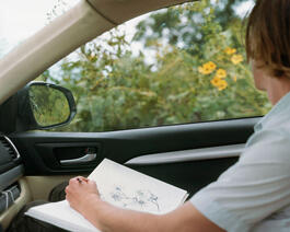USA. Green Island, Illinois. 2021. Cooper drawing flowers.