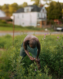USA. Rochester, New York. 2019. A gardner tends to flowers.