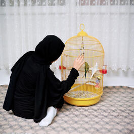 TURKEY. Rize. 2018. Asya plays with pet birds in her friend Hodja's...