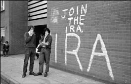 Northern Ireland. Londonderry. Masked men in front of wall...