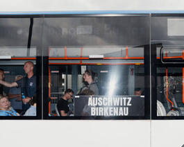 POLAND. Osiwecim. July 7, 2024. Shuttle bus at The Auschwitz-Birkenau...